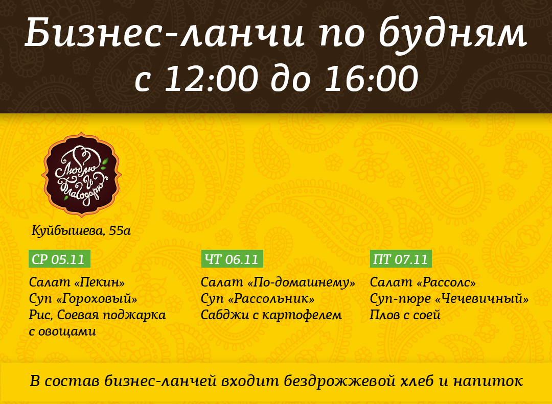 Она вырывает вас из города и суеты, погружая в спокойствие, принимая такими, как есть, наполняя теплом и добром. Это невозможно не почувствовать. Мягкий аромат специй, лёгкая музыка – здесь всё располагает к отдыху душой и телом. Добавим к этому вкусные, полезные блюда и получим безмятежный зелёный оазис в центре Уральской столицы – он так звонко отзывается в наших и ваших сердцах.