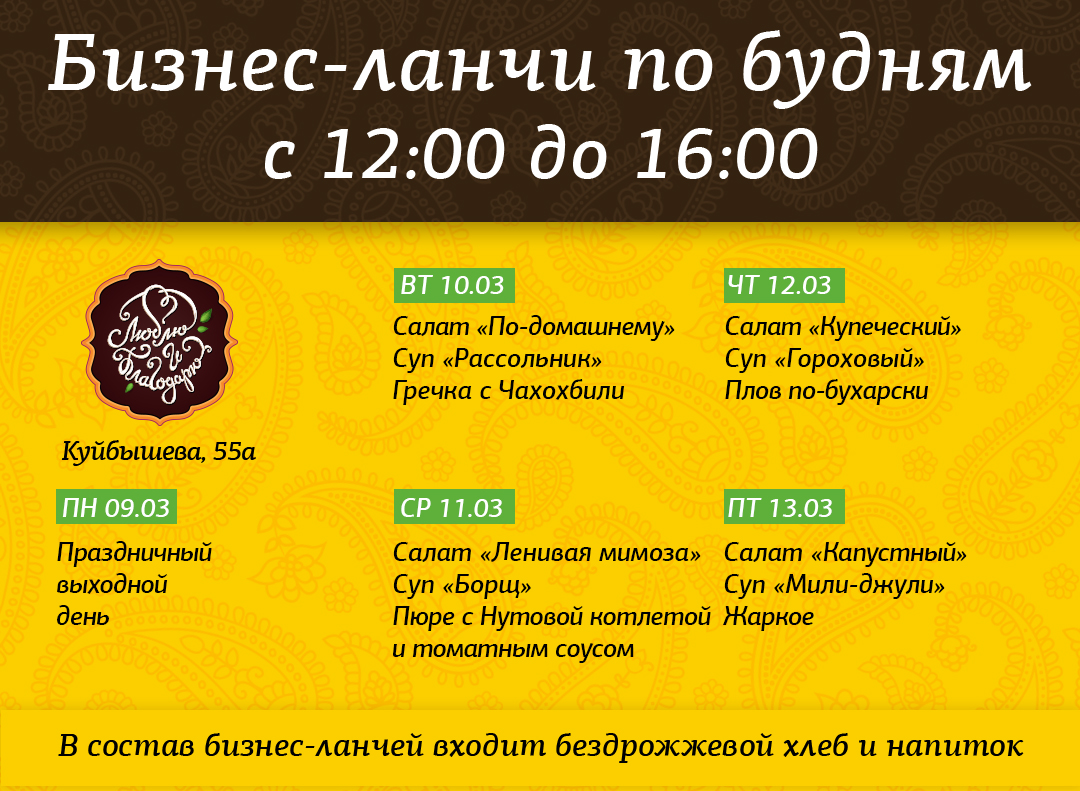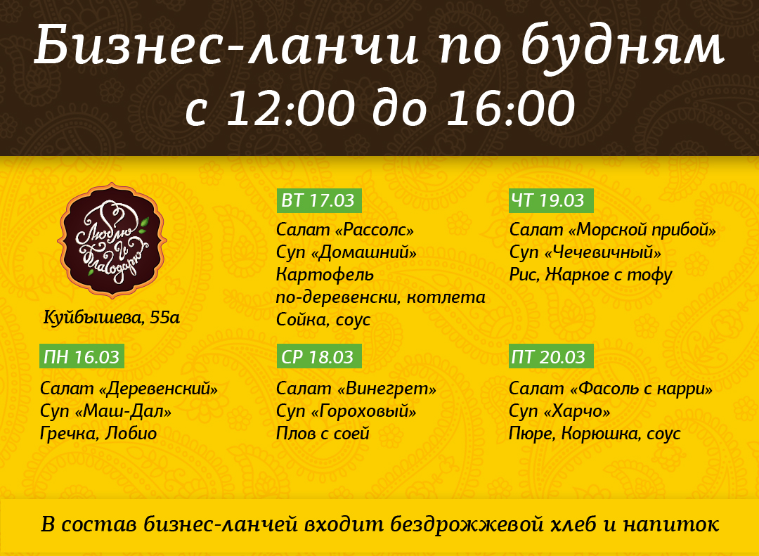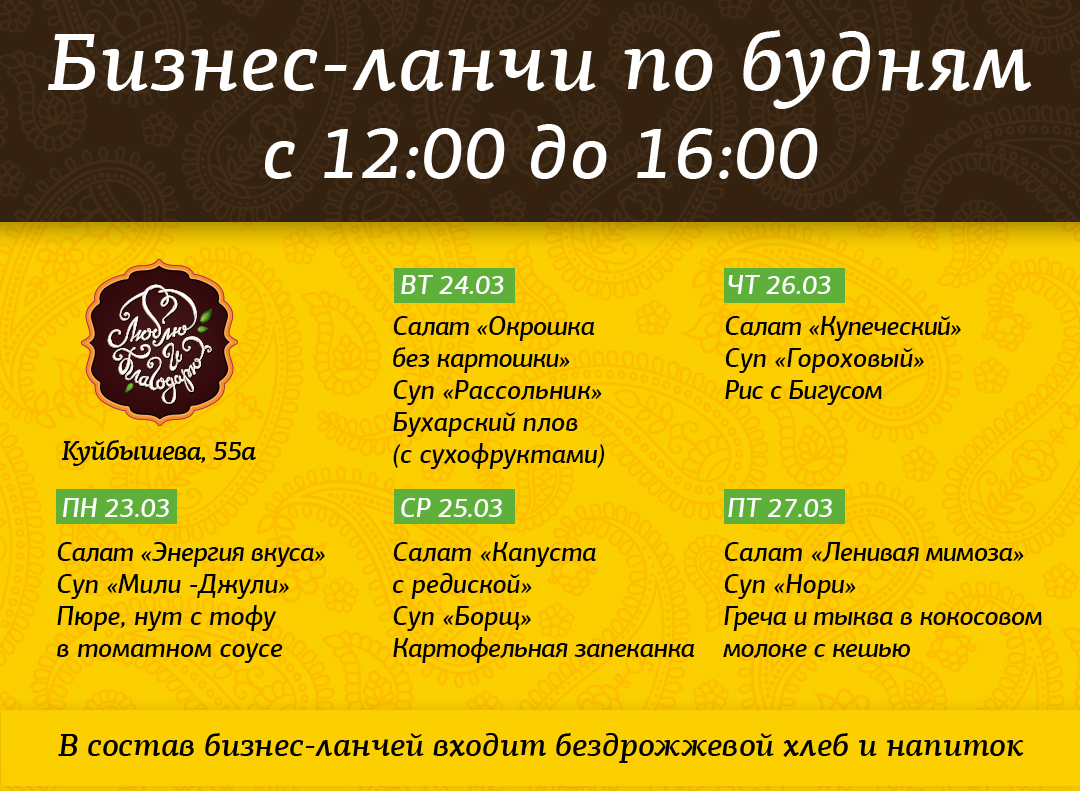 Она вырывает вас из города и суеты, погружая в спокойствие, принимая такими, как есть, наполняя теплом и добром. Это невозможно не почувствовать. Мягкий аромат специй, лёгкая музыка – здесь всё располагает к отдыху душой и телом. Добавим к этому вкусные, полезные блюда и получим безмятежный зелёный оазис в центре Уральской столицы – он так звонко отзывается в наших и ваших сердцах.