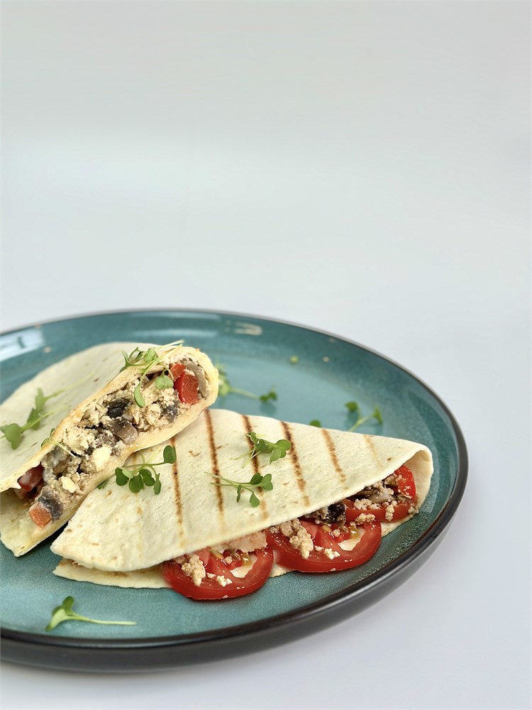 Тортилья, кешью-майонез, шампиньоны, фирменный копченый тофу, болгарский перец, специи, томаты, веганский Пармезан.