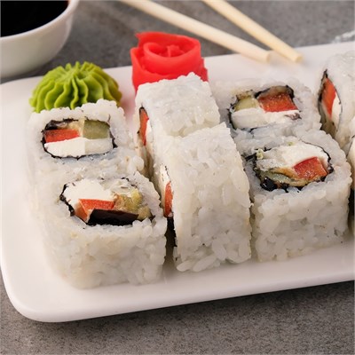 Рис, нори, маринованные огурцы, болгарский перец, зелень, сливочный сыр, баклажаны.